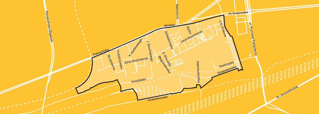 • potencjalne korytarze dla tramwaju – zarówno wzdłuż Ordona, jak i po południowej stronie osiedla ulicą Gniewkowską.
