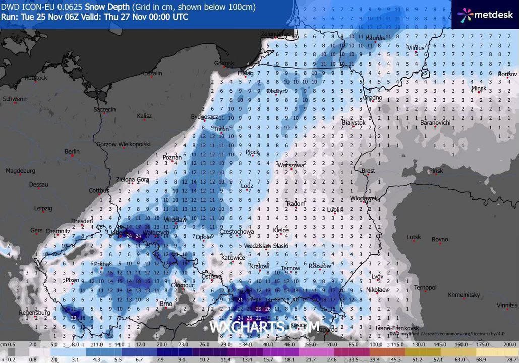 Poniżej prognozowana wysokość pokrywy śnieżnej przez model ICON ⬇️