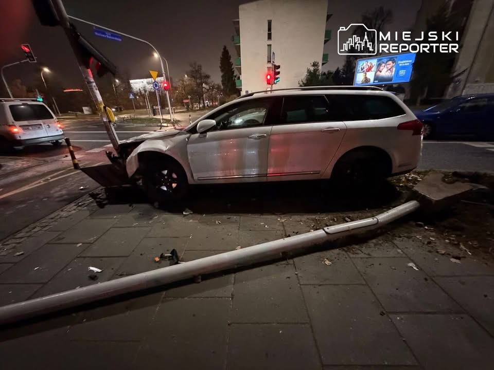 Osobówka następnie uderzyła w słupki, znak i sygnalizację przy przejściu dla pieszych 🚦🪧.