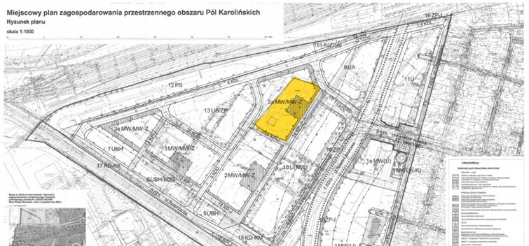 Gdzie dokładnie miałby powstać na tym obszarze park? Chodzi o miejską działkę numer ewidencyjny 3/2 z obrębu 2-09-10, która w obowiązującym miejscowym planie zagospodarowania przestrzennego o nazwie „Pola Karolińskie” przyjętym w 2008 r. posiada oznaczenie 2a MW/MW-Z, zgodnie z którym jest przeznaczona pod zabudowę mieszkaniową wielorodzinną i/lub zamieszkania zbiorowego.