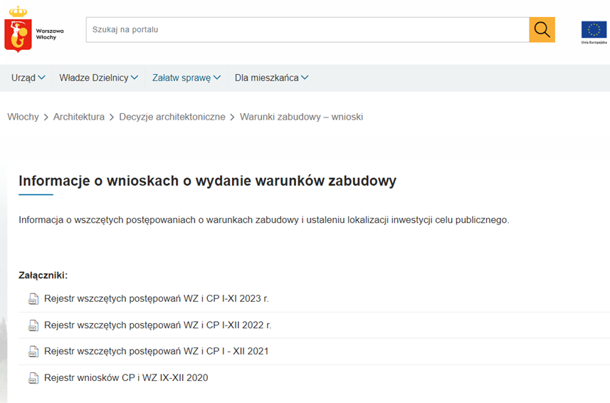 Wyżej wskazane informacje można znaleźć, wchodząc na stronę internetową włochowskiego urzędu, wybierając zakładkę „Architektura”, następnie zakładkę „Wnioski i decyzje architektoniczne” i „Warunki zabudowy – wnioski”. Na wyświetlanej podstronie będziemy mogli dokonać wyboru okresu za jaki chcemy wyświetlenia rejestru wszczętych postępowań. W przypadku najnowszych postępowań dane aktualizowane są średnio co kwartał.